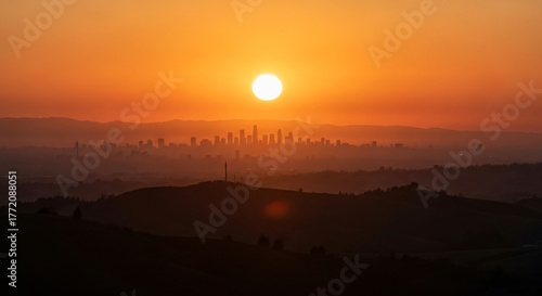 Fototapeta premium Vibrant urban skyline silhouette at sunrise with orange sky and hills in...
