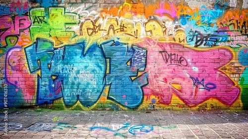 Fototapeta premium Vibrant urban street art colorful graffiti pattern beautifully displayed on...