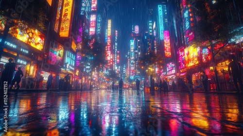 Fototapeta premium Vibrant urban street at night with illuminated skyscrapers, glowing neon signs, and wet pavement reflecting colorful lights. Bustling crowds and cars create a dynamic cityscape.