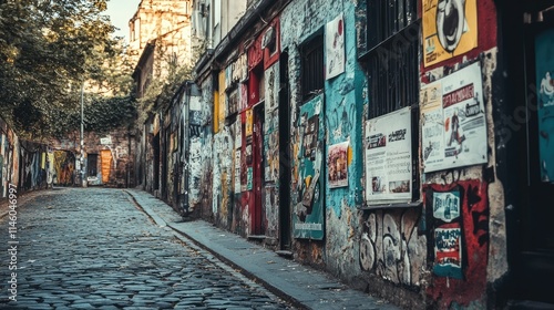 © SETSU 21, Fototapeta premium Vibrant Urban Street Scene with Colorful Murals and Historic Buildings in a Cobblestone Alley in a Lively Artistic District