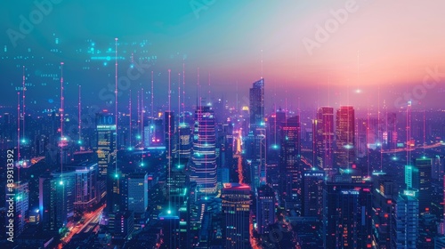 Fototapeta premium Vibrant Urban Twilight Illuminated 5G Cityscape with Futuristic Technology