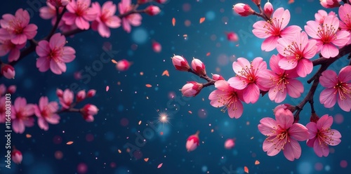 Fototapeta premium Vibrant vector illustration of blossoming plum branches & fireworks, happiness, spring