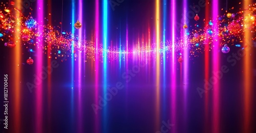 Fototapeta premium Vibrant vertical lights create futuristic tunnel. Festive ornaments dangle,...