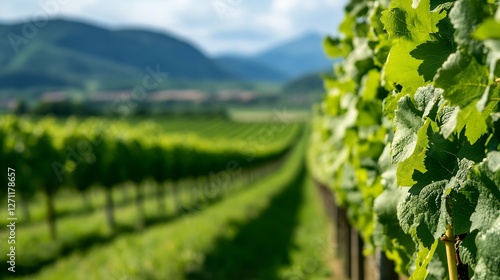 Fototapeta premium Vibrant vineyard landscape with lush green grape vines extending along the...