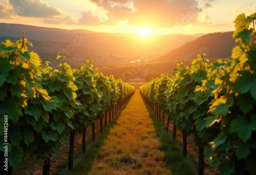 Fototapeta premium vibrant vineyard rows golden hour spectacular nature landscape grapevines glistening sunlight rolling hills agriculture, wine, sunset, field, plant, soil