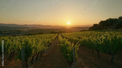 Naklejka premium Vibrant vineyard with ripe grapes under a stunning sunset casting warm hues over rolling hills and lush greenery