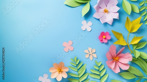 © John, Fototapeta premium Vibrant Visual Feast: Top - View of Colorful Paper - Cut Flowers with Green Leaves on Blue Background