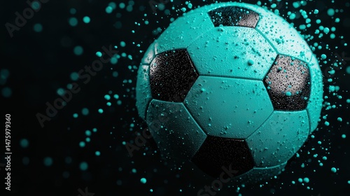 Fototapeta premium Vibrant Water Splashing Off a Turquoise Soccer Ball in a Dark Background...