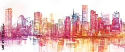 Obraz premium Vibrant watercolor cityscape skyline reflecting on water.