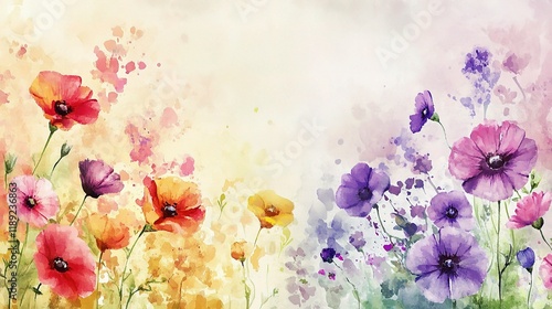 Obraz premium Vibrant Watercolor Floral: A delicate watercolor painting captures the beauty of a summer meadow with vibrant hues of red, orange, purple, and yellow wildflowers dancing in the gentle breeze.