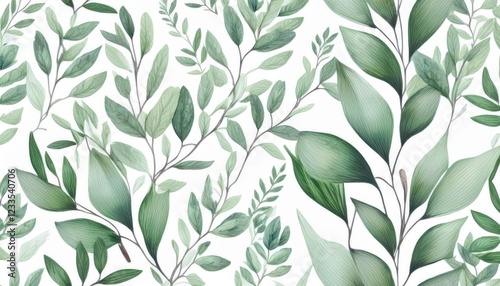 © netsay, Fototapeta premium Vibrant Watercolor Floral Composition A Lush Arrangement of Green Leaves and Branches Against a Pristine White Background, Perfect for Artistic Decor and Design Inspiration.