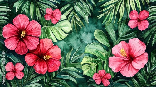 © Boonyawadee.K, Naklejka premium Vibrant Watercolor Hibiscus and Tropical Leaves Background