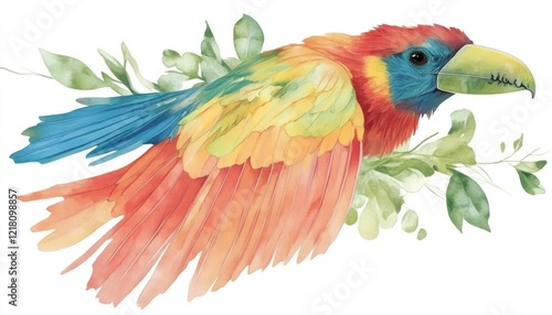 Obraz premium Vibrant watercolor illustration of a colorful parrot in flight surrounded by...