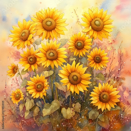 © yeandita, Obraz premium Vibrant watercolor painting of a cluster of sunflowers in a field.