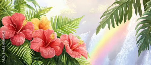 Naklejka premium vibrant watercolor scene featuring hibiscus flowers and lush greenery, with cascading waterfall and rainbow in background, evoking sense of tropical paradise