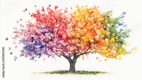 Fototapeta premium vibrant watercolor tree showcasing stunning transition through all seasons, featuring colorful leaves in shades of red, orange, yellow, green, and purple