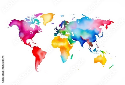 © Sanook, Obraz premium Vibrant watercolor world map, youthful style, white background, world map, white