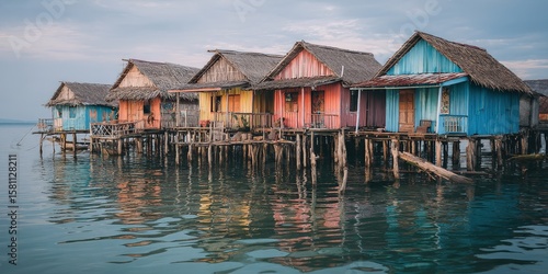 Fototapeta premium Vibrant waterfront homes on stilts reflecting in calm water.