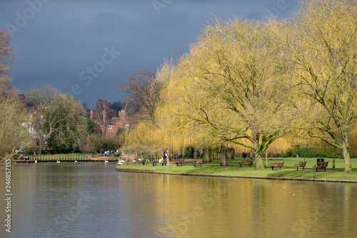 © Paul Rushton, Fototapeta premium vibrant weeping willow trees on river bend with storm in background