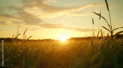 Fototapeta premium Vibrant wheat fields dance in the breeze as the sun rises on the horizon, casting warm light and creating a calm atmosphere filled with scattered clouds