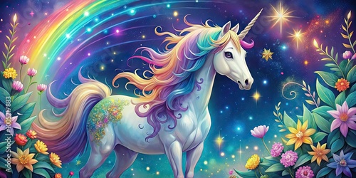 Fototapeta premium Vibrant, whimsical digital illustration of a majestic unicorn with a shimmering rainbow mane and tail, surrounded by sparkling stars and delicate floral elements.