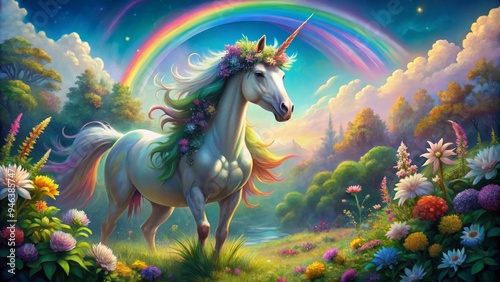 Fototapeta premium Vibrant, whimsical illustration of a majestic unicorn with shimmering rainbow mane, surrounded by lush greenery, flowers, and soft, puffy clouds in a dreamy atmosphere.