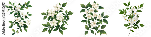 Naklejka premium Vibrant white flowers blooming on lush green foliage in a tranquil spring garden setting The delicate petals and tender leaves create a serene and elegant botanical composition