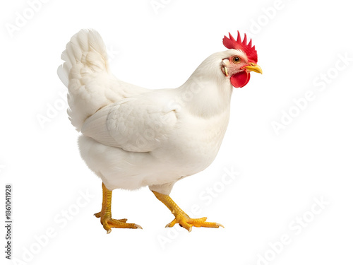 Fototapeta premium Vibrant White Hen with Bright Red Comb and Yellow Legs, standing in profile. A clean studio shot of a healthy farm chicken, isolated on transparent background.