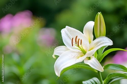 © Downloads, Fototapeta premium Vibrant white lily blooming in a lush green natural setting