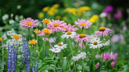Fototapeta premium Vibrant Wildflower Meadow: A Symphony of Pink, White, and Yellow Blooms
