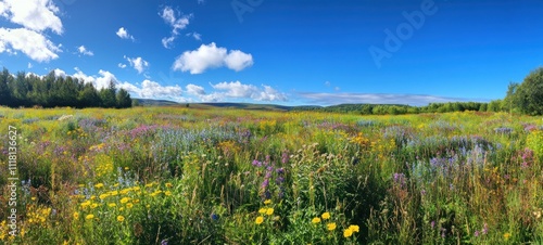 © aero, Fototapeta premium Vibrant Wildflower Meadow Under a Summer Sky