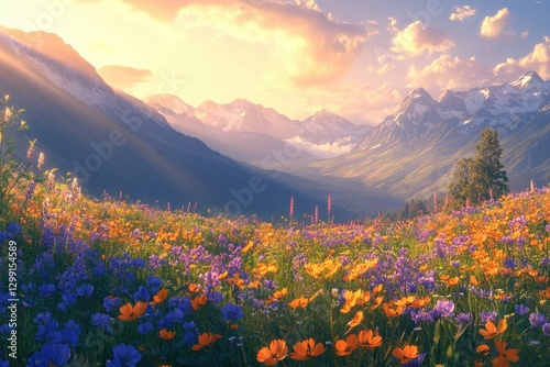 Fototapeta premium Vibrant wildflowers bloom in a picturesque alpine meadow, bathed in the golden light of sunset, with majestic snow-capped mountains in the background.