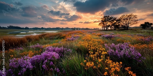 Fototapeta premium Vibrant wildflowers bloom in a serene landscape at sunset near a tranquil...