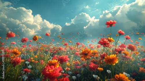 © alva studio, Obraz premium Vibrant wildflowers bloom in a sun-drenched field under a bright sky.