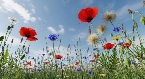 Obraz premium Vibrant wildflowers blooming under a bright blue sky