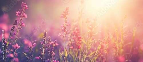 Fototapeta premium Vibrant wildflowers in a sunlit summer meadow creating a serene backdrop...