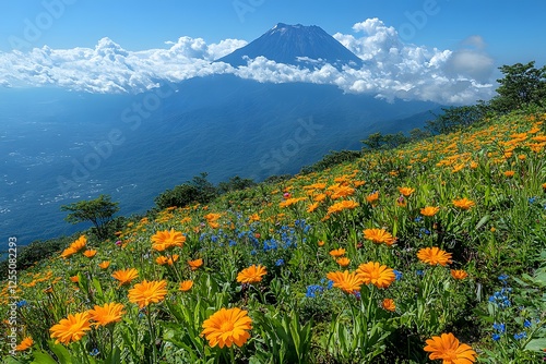 © D, Fototapeta premium Vibrant Wildflowers on Mountain Slope with Majestic Peak in Background