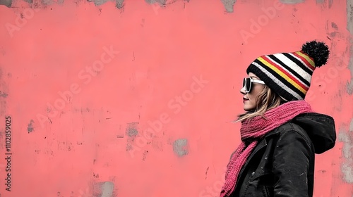© Alex, Obraz premium Vibrant Winter Fashion: Bold Young Woman in Colorful Striped Beanie and Chunky Pink Scarf - Perfect for a Playful Sports Interior Poster!