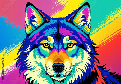 © Eliane, Naklejka premium Vibrant Wolf Portrait: A Rainbow Splash of Energetic Artistry