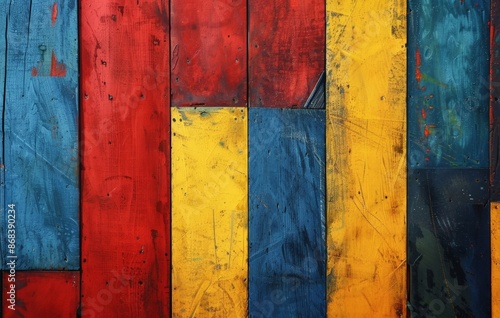 © Priya, Naklejka premium Vibrant Wooden Wall Art with Stripes of Red, Blue, Yellow, and Orange