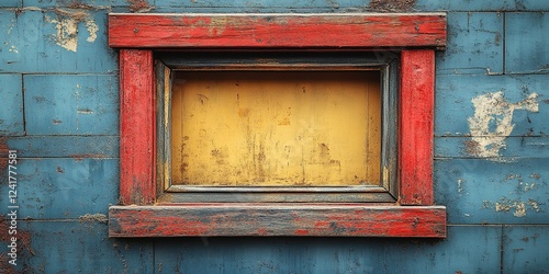 © BYAI, Naklejka premium Vibrant wooden window frame against a weathered blue wall with rustic charm