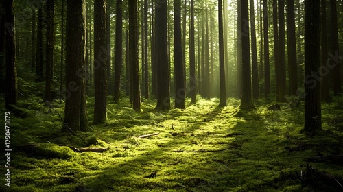 © lllCklll, Obraz premium Vibrant Woodland Path Amid Lush Forest Foliage and Filtering Sunlight