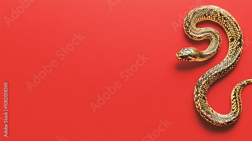 © Tackey, Obraz premium Vibrant Yellow and Black Snake Coiled Gracefully Against Bold Red Background Showcasing Natural Beauty and Exotic Charm in Contemporary Design