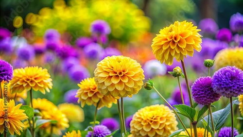 Fototapeta premium Vibrant yellow and purple flowers dance in a garden filled with lush foliage,...