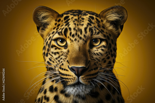 Fototapeta premium Vibrant yellow background featuring a striking leopard. Generative Ai.