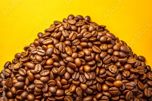 Fototapeta premium Vibrant yellow background highlights a mound of freshly roasted coffee beans,...