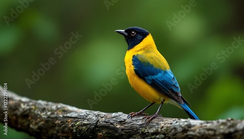 © Morits Art, Fototapeta premium Vibrant Yellow Blue Bird Perched Tree Branch Green Background