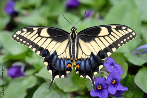 © Duskcraft, Naklejka premium Vibrant Yellow Butterfly Spreading Wings Among Colorful Purple Flowers in Garden