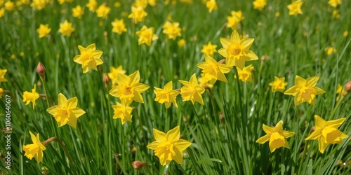 Fototapeta premium Vibrant yellow daffodil flowers blooming in a lush green field under the...