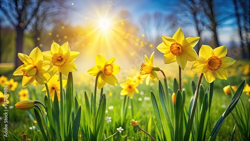 Fototapeta premium Vibrant yellow daffodils sway gently in a sun-drenched meadow, surrounded by...